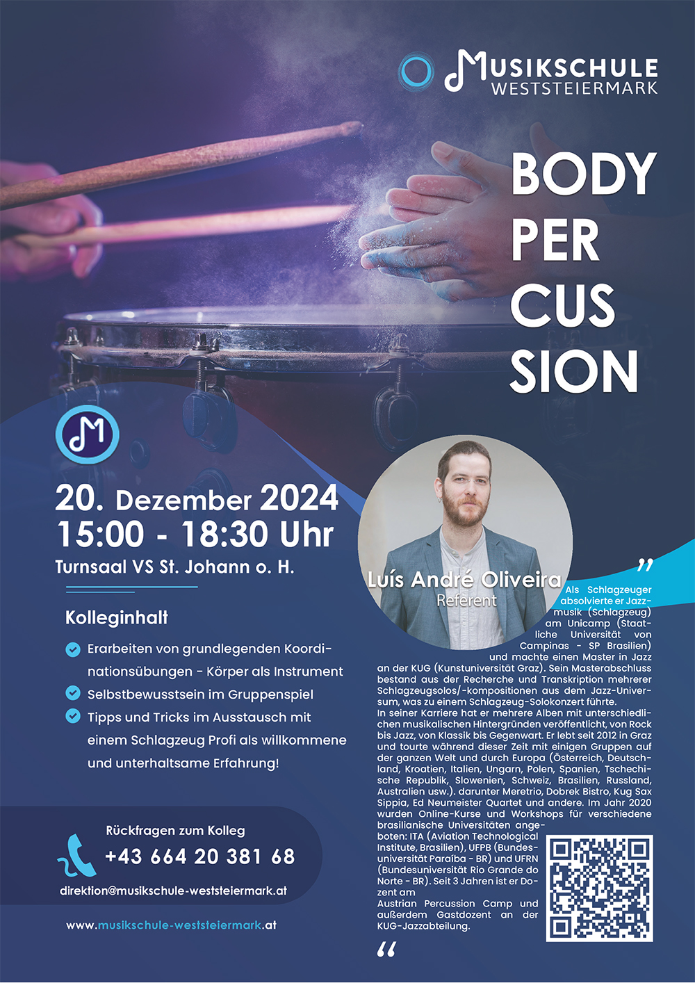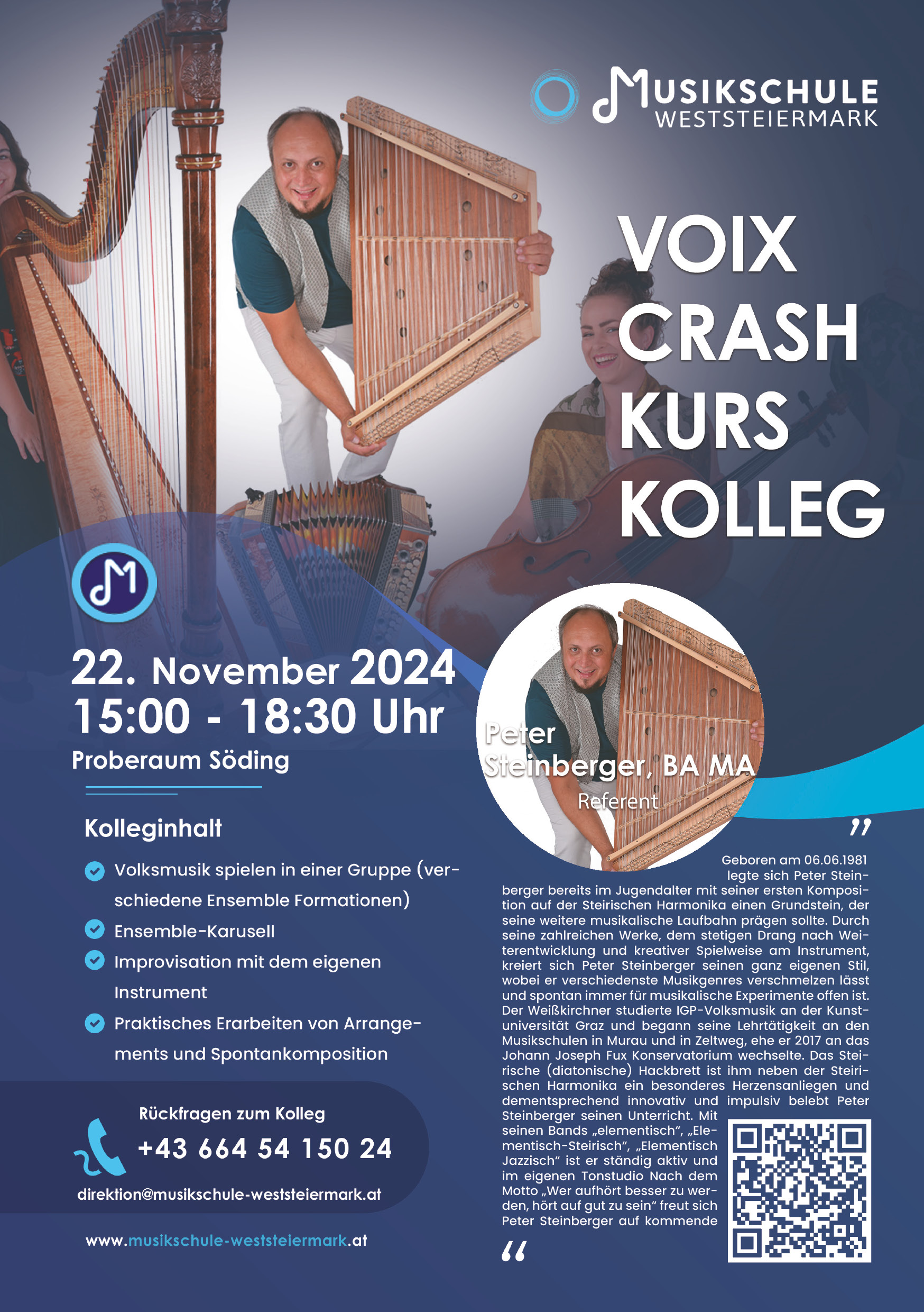 HervorgehobenProberaum SödingVolksmusik einmal in einer Gruppe spielen und die Faszination dieser interessanten Musik kennenlernen. Peter Steinberger führt durch eine spannende Reise in die Volksmusik! Teilnehmeranzahl: Max. 20 Personen