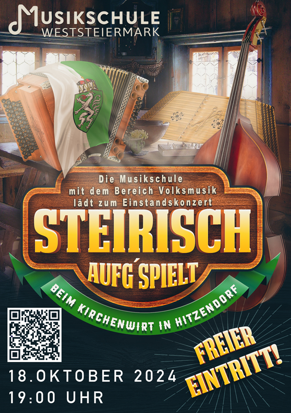 HervorgehobenKirchenwirt Hitzendorf Hitzendorf 6, Hitzendorf, Steiermark, AustriaDie Volksmusikabteilung der neuen Musikschule Weststeiermark stellt sich mit einem Debüt-Konzert vor. Es musizieren Schüler und Schülerinnen aus den Klassen von Daniel Maier, BA sowie Hans J. Stermetz, BA MA BEd Bei freiem Eintritt sind alle dazu herzlich eingeladen!